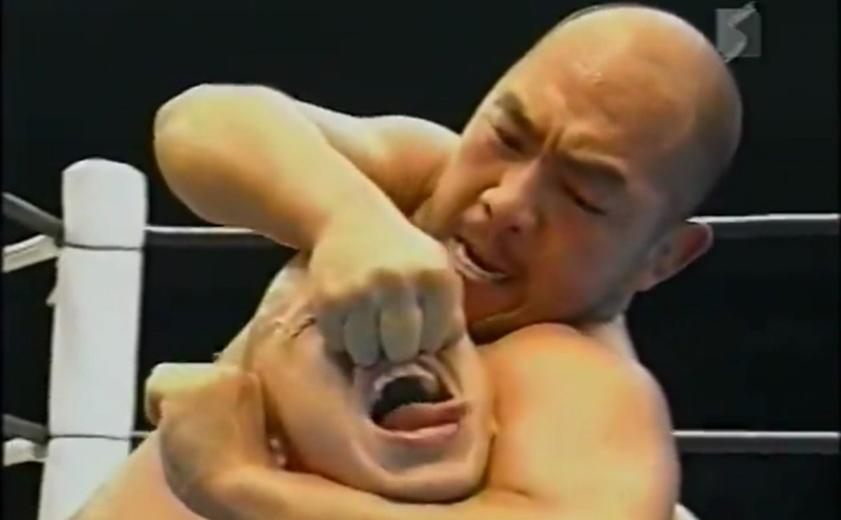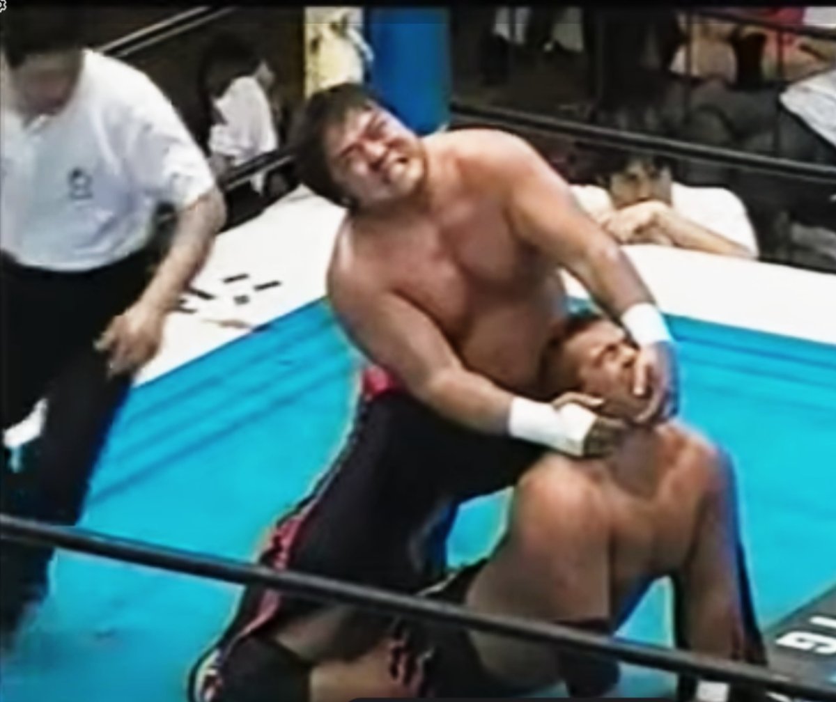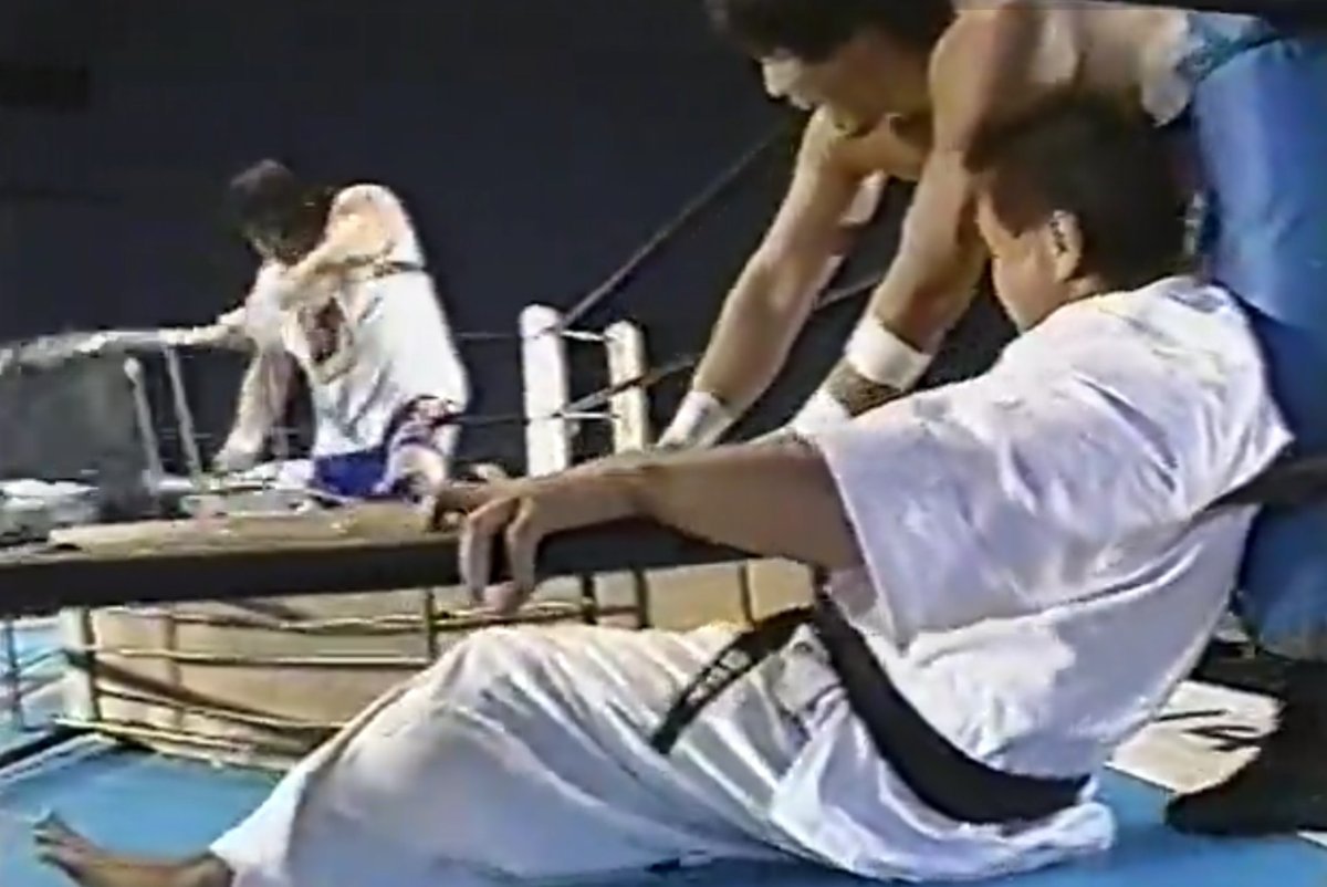 Katsumi Usuda, Kazuhiko Ogasawara & Yoshiaki Fujiwara vs. Hideki Hosaka, Kuroge Wagyuta & Masato Tanaka - At around 12 minutes, this is a god damn blast!! It's like someone did random wrestler select on Fire Pro Returns. Usuda is shoot style, Ogasawara is in his own fucking karate world...not knowing how to bump but still in a wrestling match, and Fujiwara thinks it's '86 popping his own eyebrow open with headbutts. Tanaka and Hosaka are team FMW but Wagyuta is like a budget Kensuke or Tenzan acolyte. It's great he and karate man just want to beat the crap outta each other. Yes, this is what I wanted and more. LIKED IT A LOT