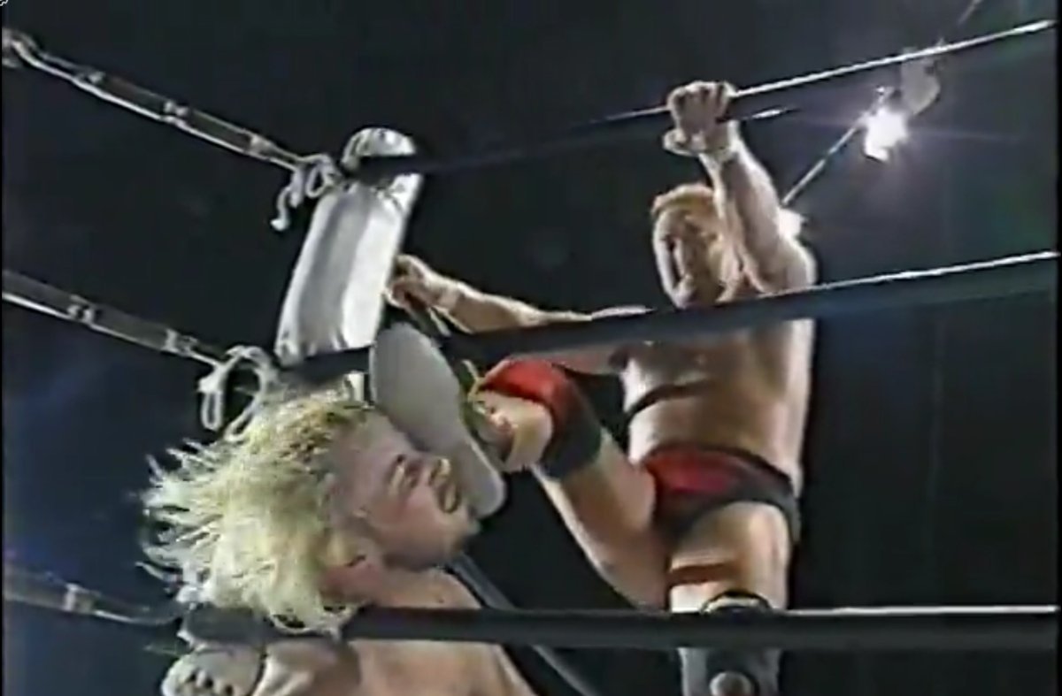 Kintaro Kanemura & Tetsuhiro Kuroda vs. Kazuhiko Ogasawara & Tatsuhito Takaiwa - This was SO much fun!! ๐ Comedy, Ogasawara doing karate moves then getting hit in the nuts multiple times, Takaiwa bringing the serious wrestling moves, team FMW/WEW doing hardcore spots...this puts a grin on my face. I LIKED IT
