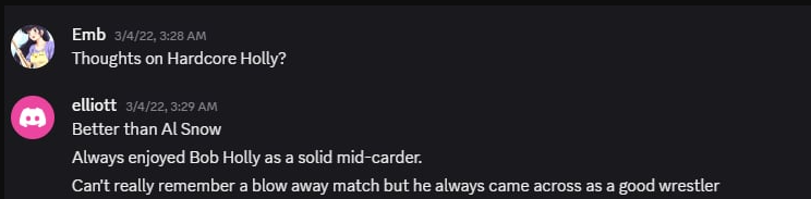 I think Bob Holly was a good wrestler, and he was as convincing as a peppy babyface who liked racing cars as he was as a grumpy old prick, so he could play multiple roles well. I don't know that I ever looked forward to a Holly match, but I also never felt like turning off when he came out for a match, which puts him over plenty of other nominees here. I've not considered him because I know of at least 100 wrestlers I think are better.