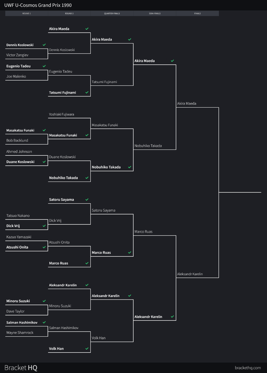 UWF Newborn – “U-COSMOS Grand Prix 1990: The Final Four” November 26th, 1990 Osaka, Japan Osaka-jo Hall Attendance: 16,000 (sold out) Broadcast: WOWOW (live) The WOWOW broadcast opens with the commentary crew greeting the viewing audience, and they break down the card for the evening. They discuss the two big semi-finals tonight and break down the rest of the card. Fans finish shuffling into the arena before Nobuyuki Furuta officially opens the event, which is, of course, followed by a light show and fireworks as the UWF theme plays. The wrestlers make their way to the ring one by one for the introductions, with the loudest pops from the crowd reserved for all four of the semi-finalists. Akira Maeda, Nobuhiko Takada, Maro Ruas, and Aleksandr Karelin all give speeches for the fans, with the last two being translated. Billy Robinson, Lou Thesz, and Karl Gotch are at ringside for formalities as well. Steve Nelson vs Billy Scott Steve Nelson and Billy Scott opened with an energetic scramble, each testing the other’s developing fundamentals. Both traded short palm strikes before instinctively dropping into repeated skirmishes on the mat, where both felt most comfortable. Nelson’s wrestling pedigree showed early as he hit a clean inside trip that put Scott on the mat, but Scott recovered quickly, using a sharp hip switch to escape a half-nelson ride and return to his feet without burning a rope break. Nelson pressed again with a double-leg attempt, only for Scott to sprawl low, countering into a tight front headlock that forced Nelson to defend and momentarily concede position. It was a back-and-forth affair as both traded rope breaks and found themselves tied 1-1 on points. As they transitioned to the mat again, Scott slipped behind, hunting the legs; Nelson tried to base out and turn, but Scott threaded his right leg through with surprising speed, dropping backward into a well-applied heel hook. Nelson fought the rotation, reaching for the ropes, but Scott tightened the crank, forcing a tap. Scott defeats Nelson via submission (heel hook), 8:12 Koji Kanemoto vs Mitsuya Nagai Kanemoto and Nagai were eager to test each other’s mettle, and both were hoping to get a win tonight in front of a sold out crowd in Osaka-jo Hall. Nagai started with a ton of energy, though Kanemoto’s sharper skill set quickly established a clear difference. The opening minutes saw Nagai pressing forward with eager but ragged kickboxing combinations. Nagai relied on snapping low kicks, but overcommitted with body shots. This allowed Kanemoto to answer with tighter, more balanced striking, stinging him repeatedly with clean kicks to the ribs and brisk palm strikes that disrupted Nagai’s rhythm. A rushed clinch attempt from Nagai allowed Kanemoto to counter with a quick inside reap, taking the fight to the mat, where his superior grappling showed; he transitioned smoothly from side control to a scarf hold before Nagai scrambled desperately toward the ropes for a rope break. Kanemoto continued to press Nagai on the mat and exposed his overzealous striking attempts with clever takedowns. Eventually, Kanemoto built up a 2-1 lead on points through ropebreaks, with Nagai getting a knockdown after catching Kanemoto with a sharp palm strike to the nose. As the pace settled, Nagai swung wildly again, this time walking straight into a sharp low kick that buckled him briefly, costing him a knockdown after he failed to rise cleanly before the count. Sensing momentum, Kanemoto surged, firing a flurry of body strikes before snapping into a waist lock. Nagai tried to peel the grip, but Kanemoto powered through with a crisp German suplex, bridging for the decisive pinfall. Kanemoto defeats Nagai via pinfall, 12:03 Nikolai Zouev def. Willie Peeters via submission (banana split), 11:29 Andrei Kopylov def. Naoki Sano via submission (kneebar), 10:31 Kiyoshi Tamura & Masahito Kakihara vs Yoji Anjo & Tatsuo Nakano Tamura and Nakano opened the bout with a mix of caution and strategy. Tamura moved lightly on his feet, hands open and relaxed, while Nakano marched forward with his bulldog demeanor. Nakano tried to overwhelm him early with swinging palm strikes to the head and body, but Tamura’s footwork and timing kept him just out of danger, countering with sharp low kicks and quick level changes that forced Nakano to sprawl repeatedly. When Nakano finally caught Tamura in a rough clinch and tried to muscle him down with a front headlock, Tamura used his agility to pivot behind, tripping Nakano into a clean takedown that brought the crowd to life. On the mat, Tamura flowed effortlessly between positions, threatening a cross-armbreaker until Nakano managed to lunge for the ropes for the first rope break of the match. Kakihara tagged in next and immediately unleashed a barrage of fast palm strikes that rattled Nakano, forcing him backward into his own corner, where Anjo tagged himself in to stabilize the pace. Anjo entered with tighter fundamentals, testing Kakihara’s raw aggression with crisp body kicks and measured palm strikes. When Kakihara swung too boldly, Anjo countered with a lightning single-leg, dragging him into a scramble before securing top control. Kakihara’s speed allowed him to slip free and tag Tamura back in, resetting the match’s rhythm. The match continued at a solid pace, and both teams managed to get two points each after several back-and-forth encounters, before Tamura and Anjo found themselves facing off again. Tamura and Anjo exchanged a rapid series of kicks and palm strikes, with Anjo landing a clean shot to the ribs that briefly staggered the younger prodigy, earning the first knockdown of the bout after Tamura took a moment to rise under the referee’s count. Recovering quickly, Tamura shifted tactics, baiting Anjo into overcommitting on a body punch; he ducked under, snatched a waist lock, and dragged him into a fluid takedown that transitioned directly into a leg entanglement. Anjo scrambled 