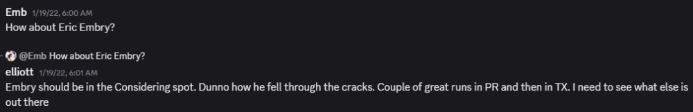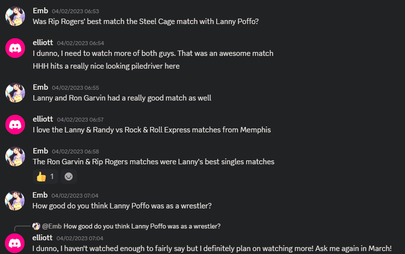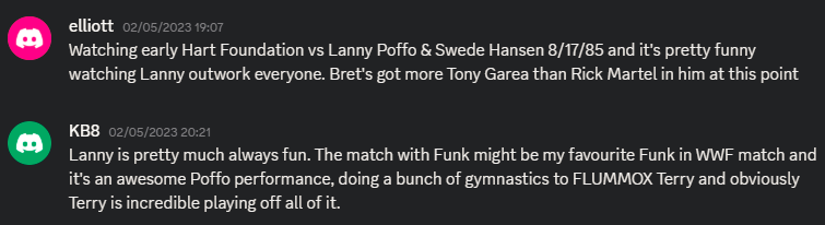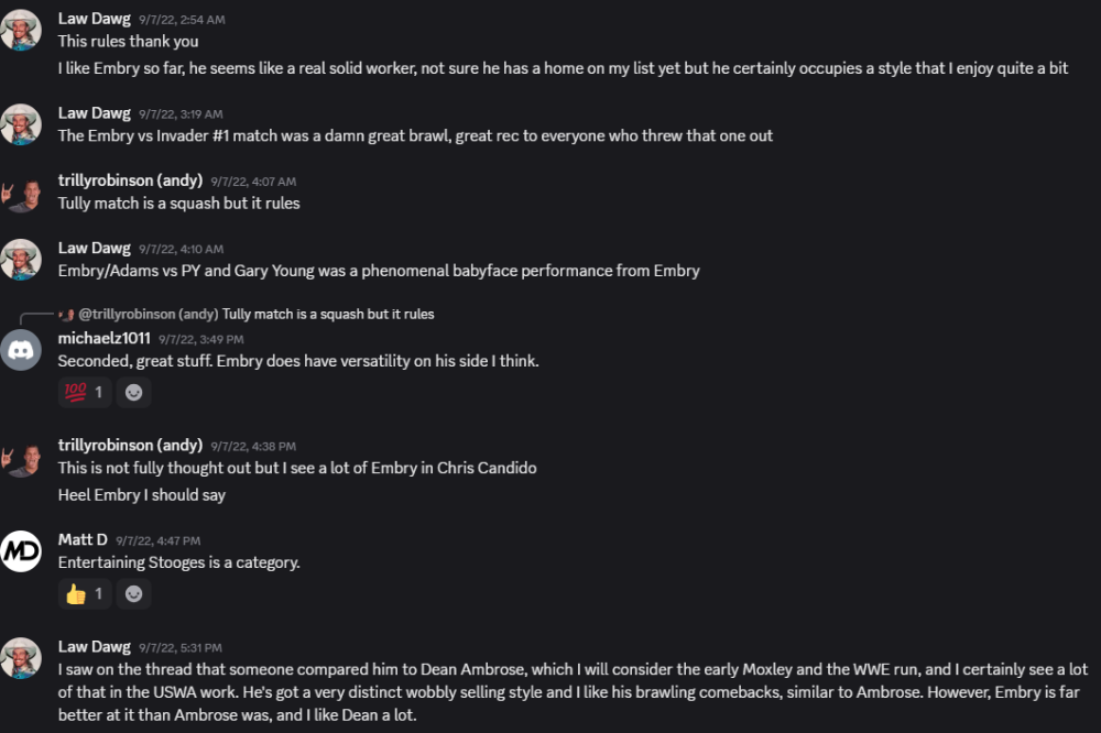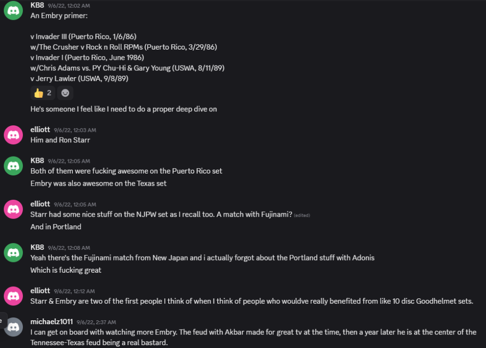 There's more than 100 wrestlers who have threads but as of right now will be ineligible to vote on in April as nobody has posted in their threads since the last poll. But for many of these wrestlers people have expressed opinions about them in the discord server. If nobody objects to me screenshotting posts from their and putting them here as evidence that these wrestlers have been discussed since the last poll in a GWE context, I will do so for a bunch of 'em. Anyway here's Matt D's thoughts on Sakaguchi.