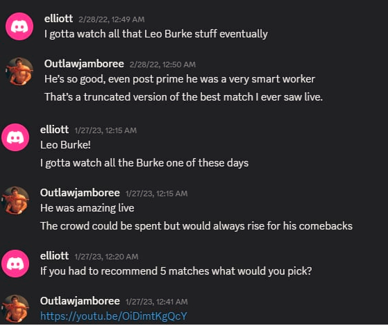 Some posts from the discord and the matches outlawjamboree are linked under the screenshot Dynamite Kid vs Leo Burke Nick Bockwinkel vs Leo Burke AWA World title match WWC: Invader #1 vs. Leo Burke (1990) Ron Starr vs Leo Burke