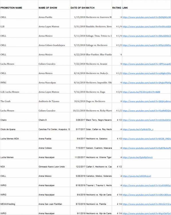 I attached a file to that previous post. It's a spreadsheet of standout Hechicero matches from the past few years. Lots of other stuff listed on cubsfan's site: http://www.luchadb.com/wcards/hechicero(cmll).php Hechicero doesn't have the stand-out apuestas matches, but that's CMLL's fault and nothing he can control. He's often the most interesting guy in otherwise dull trios. He is going on 15 years or so of absolutely shining when given the chance, though. Could probably make top 25 in my ballot. I will come back with some links/suggestions to older matches later.