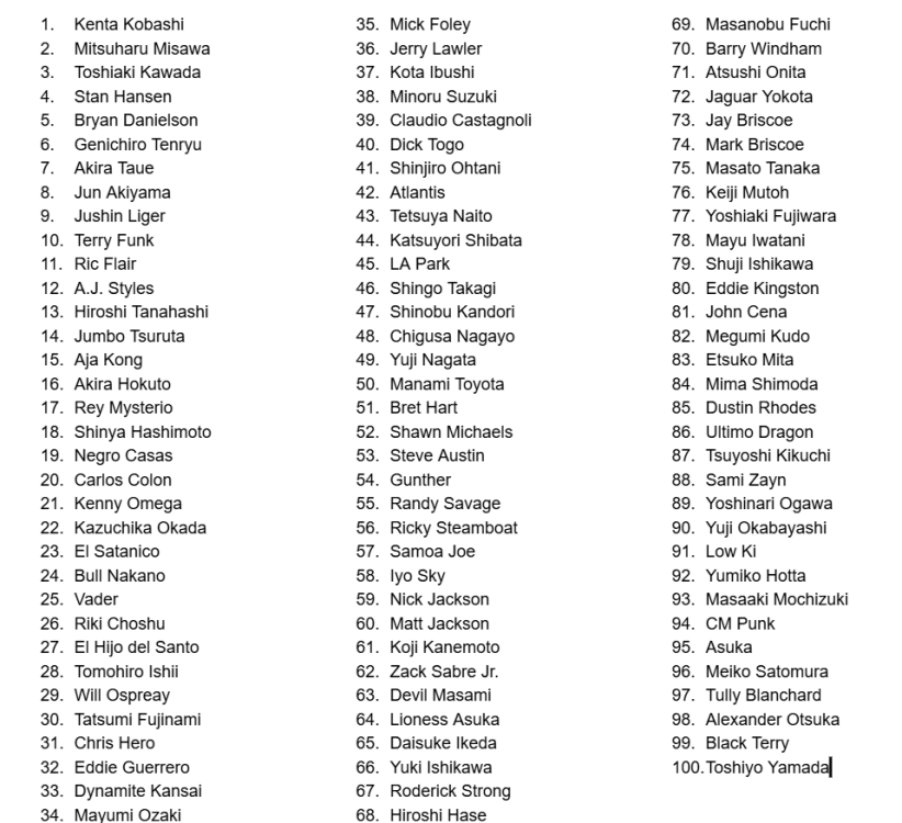 17. Making my ballot: 1. Akira Taue 2. A.J. Styles 3. Aja Kong 4. Akira Hokuto 5. Atlantis 6. Atsushi Onita 7. Asuka 8. Alexander Otsuka