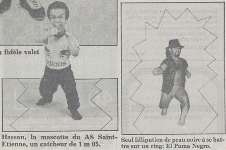 Speaking of the midget wrestlers, I just randomly stumbled upon this information while looking for something else. Hassan, apparently, used to be the mascot for the AS Saint-Etienne football club. Saw this mentioned in a 1988 article for a FEC show. Then I googled it and the second photo below popped up. It's said to be from 1976 and lists him as Hassam Handami (it's probably Hassan and they misspelled it).