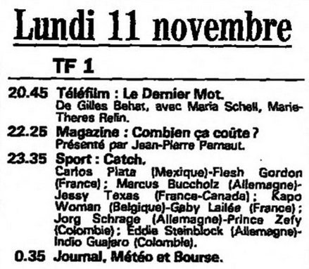 Cowboy Lang and Tiny Tom were in France only in 1982 for Roger Delaporte. They were visiting stars. These 1986 midgets were most likely locals or at least lived locally. They were part of Flesh Gordon's crew and I have them working Flesh shows in 1986, 1987 and 1988. This 1986 midgets match aired only on local TV in the Picardy region. There was no catch on French national TV in 1986. Well, no proper catch anyway. There was a women's mud wrestling match that aired on A2 in April 1986, but the less said about that, the better. Alright, I've heard you say this before many times and I've always let it slide, but it's starting to annoy me so let's set the record straight. Your perception of CIC is completely wrong. CIC (Corporación Internacional de Catch) was something that existed briefly in the 1930s. That's it. Full stop. I've researched Barcelona and other Spanish towns post-WWII and I've seen exactly zero mentions of CIC. It simply did not exist in that era. I'd like to also point out that contrary to what one might read online elsewhere, Spanish wrestling did not die in the 1970s. Victor Castilla and Jacobo Rossi were still running their "Los Colosos del Ring" promotion in the mid 1980s, and they even set up their own governing body in 1984 because they did not like how the amateur wrestling federation Federación Española de Lucha was handling pro wrestling (in post-WWII Spain the amateur federation was the governing body for both amateur and pro wrestling). Yes, most Spanish promoters were done by the end of the 1970s but the idea that wrestling in Spain died altogether in the 1970s is wrong. Bonus: here's a World Welterweight Championship match that aired on Spanish national TV in 1983 .