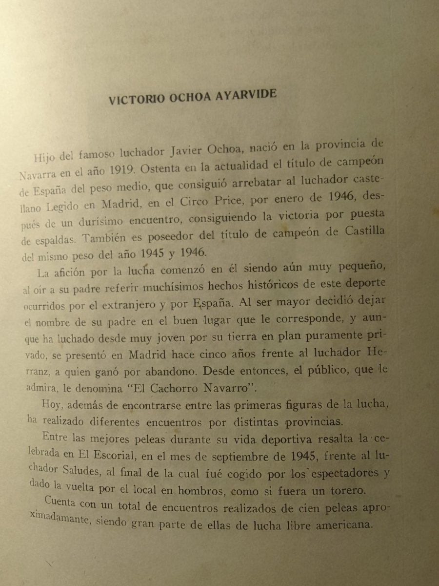 Ah well, I've got a REAL one! 😄 There are two sections of interest to pro wrestling fans, the biographies and "Prensas de Lucha Libre Americana (American Wrestling holds). Plus also there's a group photo of thirties wrestlers in a ring and that shit of Javier Ochoa (although this was clearly him in later life so Spain had gone catch by then.)