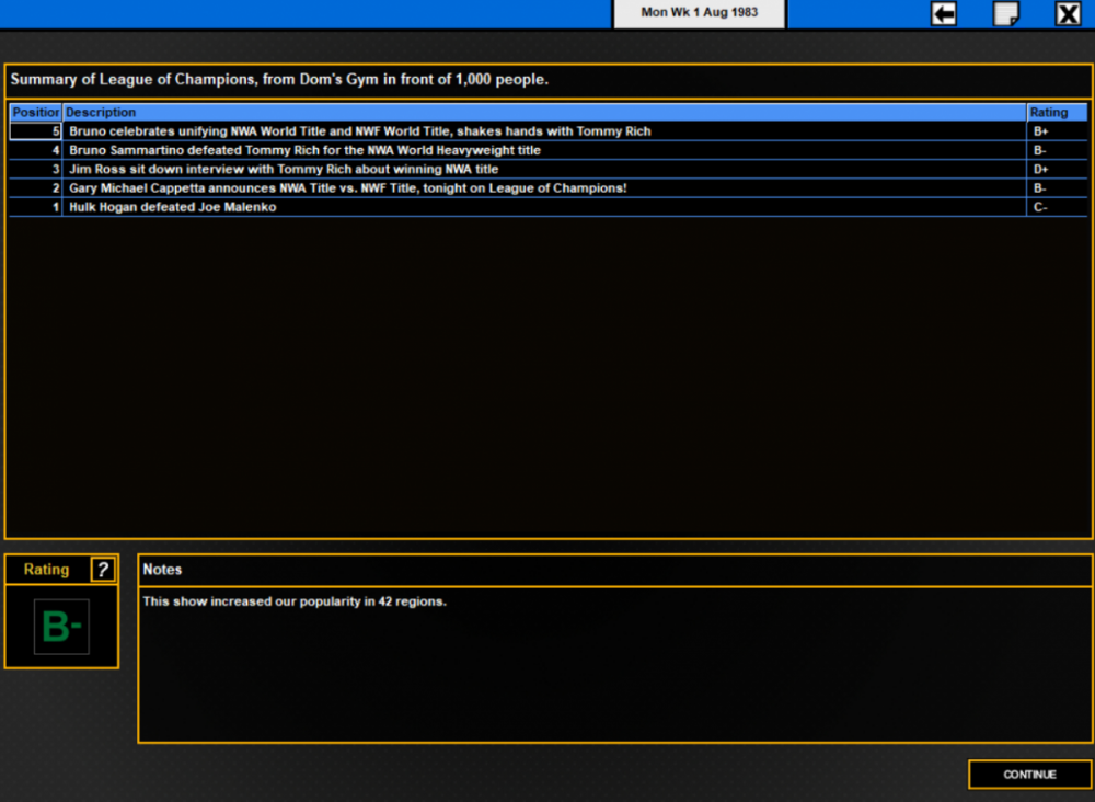 JerryvonKramer Posted September 11, 2019 Author Report Posted September 11, 2019 League of Champions advanced the tournament another match with Rick Rude going over Don Diamond. The Harts continued to pick up steam with Bret Hart's performance particularly standing out against Doug Somers and Jerry Valiant. Greg Valentine came in for a solid match against Bruno in the main event. The Ross / Piper pairing on commentary has a little teething trouble, but on the whole seems to be lifting the product.