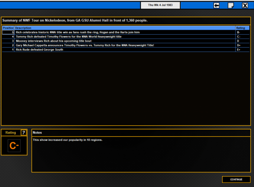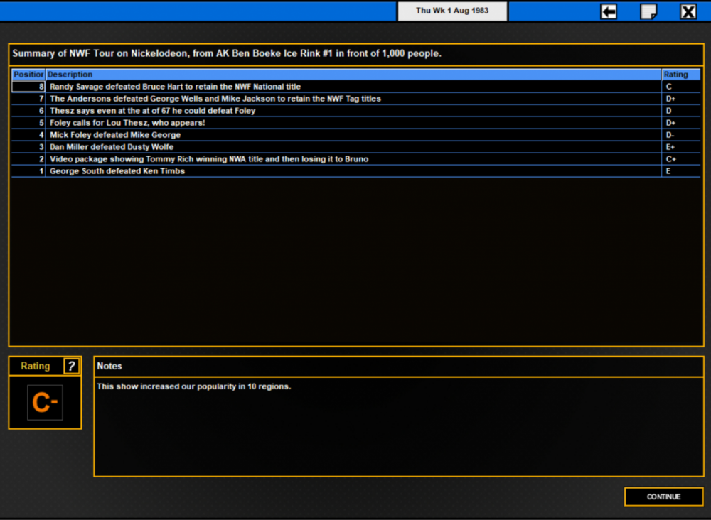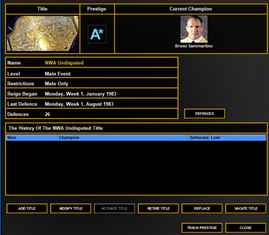 JerryvonKramer Posted September 11, 2019 Author Report Posted September 11, 2019 Mohammed Saed has just handed in his notice, and Don Leo Jonathan -- who seems to have a lot of heat in the locker room as a road agent -- has also requested to leave which has been agreed, both are gone from NWF. Coming in the other way is Bobby Eaton and David Sammartino back from rehab. This seems a good time to take stock of the roster. Let's look at the out-of-ring talent: The Mooney / Tolos partnership is still quite a sub-par pairing for TV and I am considering transitioning Mooney into an interviewer role and bringing in a new play-by-play guy to pair with Roddy Piper on the A show with Tolos on the B show. An offer has been made to try to lure Jim Ross away from Mid-South. With Don Leo Jonathan leaving, Lou Thesz continues as the main road agent, as well as on-air President of NWF, and Dominic Denucci is an agent also. Brian Hildebrand is the only ref and Grand Wizard the only manager. As things stand more are not required. Let's look at the job squad now. Scicluna is still in rehab and it strikes me that there are no heel jobbers on the roster. Offers have been made to Lanny Poffo, which should make Savage happy if he comes, Paul Christy, Terry Gibbs, and Victor Rivera. Next up, the midcard. Most of these guys are currently in the tag mix with the exception of Foley and Douglas who are long-term projects. Foley is still only 17 and Douglas is 18. I want to keep them bubbling away on the undercard for a good while -- with Foley working the angle of being strange or mentally deranged. There are two wrestlers who a notch above these workers: Arn is still quite young here but is already tag champion with Ole, and I am not yet sure what to do with Eaton. The roster may be getting big enough to introduce a secondary singles title. Finally the stars: The promotion has been ticking over and steadily growing in its first five months with Bruno working various one-shot challengers brought in by the Grand Wizard in the Vince Sr pattern. But Bruno is 47 years old and this will not be good long-term. In the short-term this can continue ticking over, but new stars need to be built. Tommy Rich and Hulk Hogan are both already popular regional stars with national recognition. Savage is less well known and Rude still virtually unknown. Piper is a pretty big star, especially in the Mid-Atlantic and South West regions, as well as in the North West. The challenge will be to create some hot feuds involving these guys to build them to a point where any could be viable contenders for Bruno's title. The establishment of a secondary heel champion with babyfaces chasing him might help here. Looking at the options, Rude is not yet ready for this role, so it will be between Savage and Piper. I have yet to use Piper in the ring at all, he is presenting Piper's Pit on the B show currently -- this may well get switched to the A show. That leaves Savage as the secondary champion. And I think a tournament is the obvious way to do this. Perhaps Piper could form an alliance with Savage and The Andersons with a stated mission to take over the world of NWF as the true "Masters of the League of Champions". Yes, a stable! Perhaps this is where Bobby Eaton comes in as a member of this group. The stable can be called "The Five Star" -- not only a nod to the dirt sheets but also the idea that the five men form five points of a star. The story will then be of Hogan and Rich both turning up to stop this group taking over and allying with the Harts. Then we have: Hogan vs. Piper as the headline feud. Rich chasing Savage for the secondary belt. Harts chasing Andersons for the tag titles. Bobby Eaton in the role of being the first obstacle to face or slotting in as tag partner where necessary. All the while that goes on Bruno will continue to face villains of the month managed by Grand Wizard and defending his title almost detached from the rest of the card. Have just tried to sign Miss Elizabeth also, who will add some flavour to the whole deal.