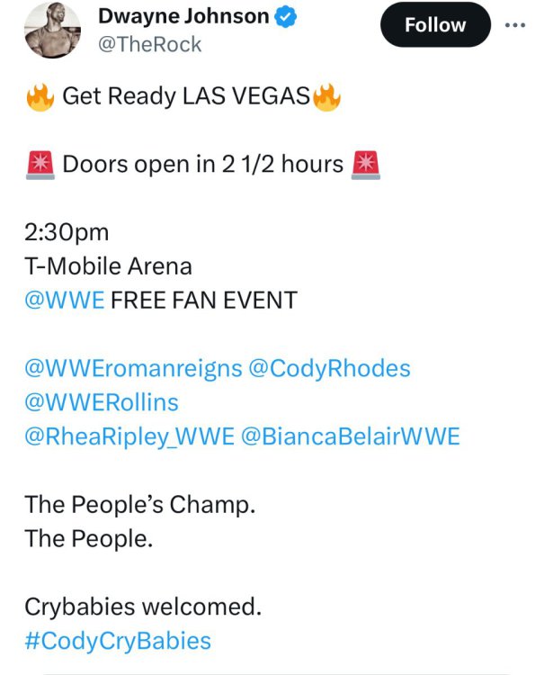 Sweet Brown Koko Posted February 6, 2024 Report Posted February 6, 2024 1 hour ago, Jmare007 said: I'm all for live crowds booing Rock, forcing him to react on the spot and not do the same old rutine and catchphrases. Him having to be real and improvise is what makes him a special performer. I'll be shocked if he doesn't pivot to a more "Hollywood Rock" type of persona when the boos start on Thursday's press conference. THIS!! The Rock has to own this. Cody shouldn’t have to do any explaining. It should be ALL ROCK!